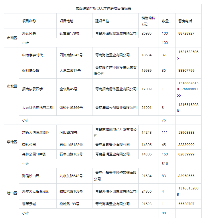 情况表中包括市南区1个项目、市北区4个项目、李沧区3个项目、崂山区3个项目、西海岸新区4个项目、城阳区3个项目、高新区2个项目、胶州市1个项目、莱西市1个项目。名单中既有这些在售产权型人才住房项目的名称、具体地址,还包含建设单位、销售均价、数量以及看房电话。(信网记者)