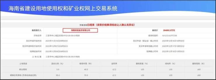 值得注意的是,出让文件要求,竞得人须自交地之日起5年内在三亚市域新增投资总额不低于100亿元。