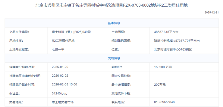 3、通州区宋庄镇丁各庄等四村城中村改造项目FZX-0703-6002地块R2二类居住用地,该地块位于通州区宋庄镇,起拍价15.62亿元,折合起拍楼面价约1.79万元/平方米。项目用地面积48537.615平方米,规划地上建筑规模87367.707平方米,容积率1.8,建筑高度≤36米(局部≤45米)。