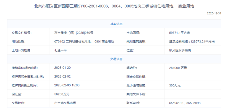 2025年12月31日,北京市规划和自然资源委员会挂出2026年首批宅地预申请及挂牌信息。其中3宗此前处于预申请状态的住宅用地正式转入挂牌阶段,分别位于顺义、石景山、通州,集中出让时间均为2026年2月3日,三宗地块的集中入市将为新年北京土地市场拉开序幕。