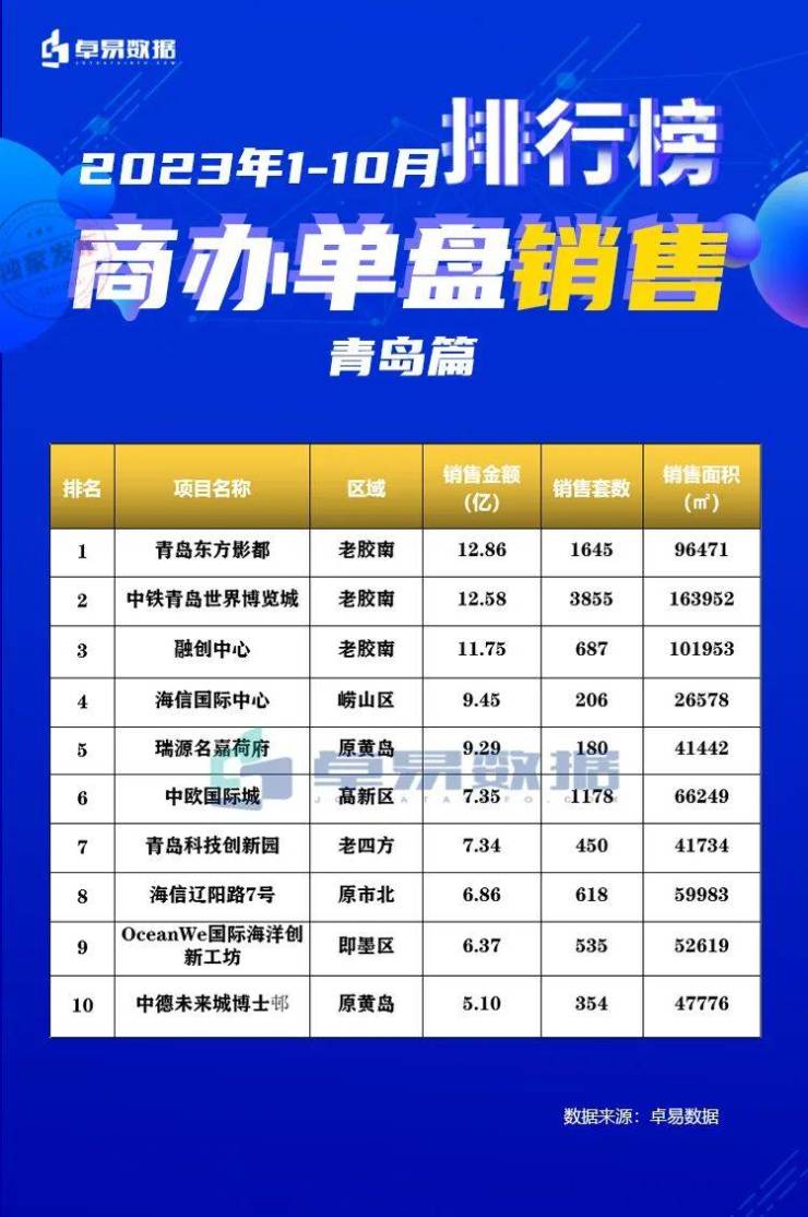 商办市场中,TOP10网签88.94亿,其中东方影都集中签约12.86亿,中铁青岛世界博览城12.58亿,融创中心11.75亿。