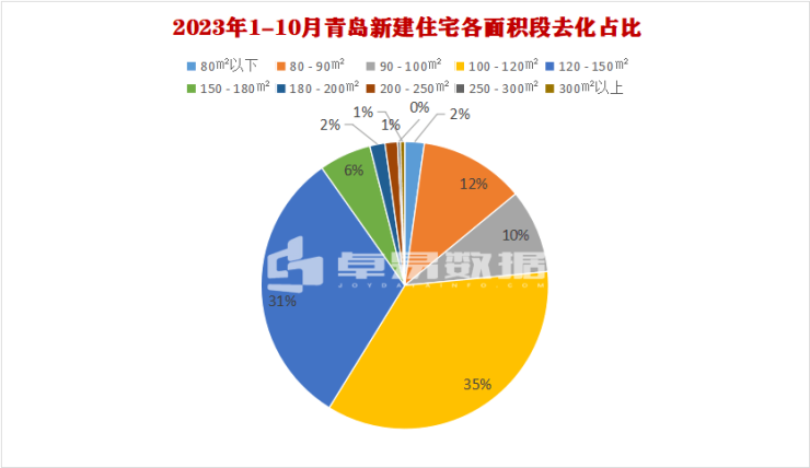 2023年1-10月在全市的商品住宅去化中,从需求结构来看,100㎡以下的占比只有24%,100-120㎡面积段成交最多占比35%,与120-150㎡两个面积段加起来合计约66%。
