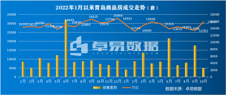 10月青岛新建商品房成交4969套,成交58.7万㎡,成交总价93.04亿,本年度仅高于“阳康”及春节叠加的一月,近些年十月历史新低;环比9月分别下降71.86%、66.29%和59.99%;同比去年分别下降29.61%,31.87%、31.74%。其中10月新建住宅成交3882套,均价16515元/㎡。
