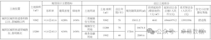 地块位于贤城路东、春阳路北,占地面积13280㎡,容积率1.3,建筑面积17264㎡(商住比15:85,商业2589.6㎡、住宅14674.4㎡)。起拍地价5152元/㎡,起拍总价8895万元,竞买保证金2668万元。