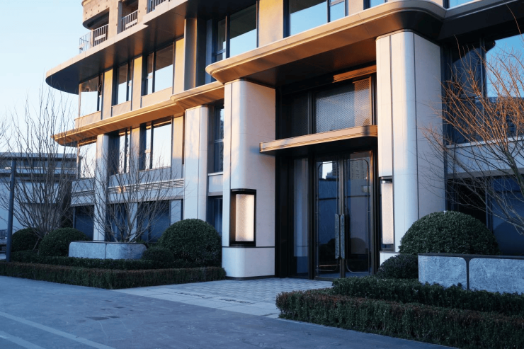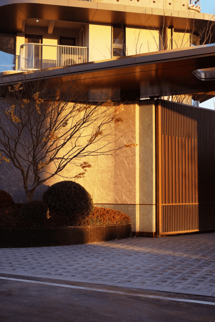 风华之门:西侧大门,入口处以一整面芬迪绿奢石景墙,作为与城市的首次对话。其肌理如凝固的海浪,温润中蕴藏力量,是对青岛山海轮廓的抽象致敬。