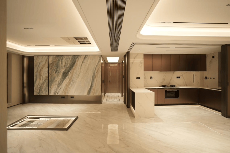 碧海伽蓝岩板背景与冠珠冰川岩板地面,在光影下与窗外海景呼应;由朴悦设计郭子伟先生操刀的弧形吊顶与隐形风口等细节,让美学隐于无形。