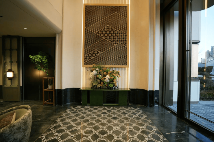 山海艺境:归家大厅以“回”字纹铺地,巧妙转译青岛草绳编织艺术;天然安哥拉黑奢石缀饰外侧水景,营造奢雅静谧之境。
