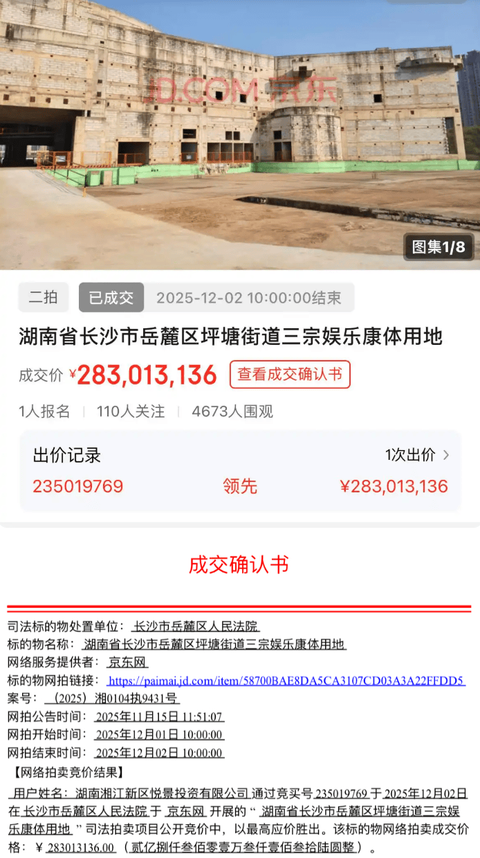 12月2日,据京东资产交易平台披露的信息显示,湖南省长沙市岳麓区坪塘街道三宗娱乐康体用地进行司法拍卖,最终被湖南湘江新区悦景投资有限公司以底价约2.83亿元的价格拍下。