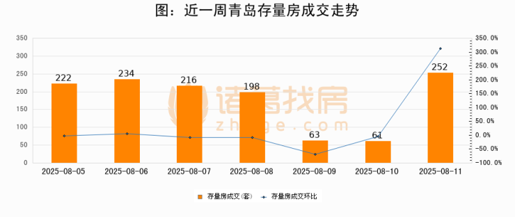 从存量房来看,2025年08月11日青岛存量房单日成交252套,比昨日增加191套,环比上涨313.1%。从近一周存量房成交来看,青岛存量房日均成交套数为178套,08月11日单日成交252套,高于近一周平均水平41.6%。