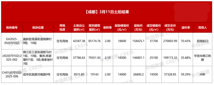 3月11日上午,成都出让3宗宅地,分别位于锦江区、高新区和成华区,总土地出让面积89945.86平方米,总规划建筑面积183699.7平方米,总起始价约33.20亿元。最终,3宗地块均溢价成交,共收金50.65亿元。