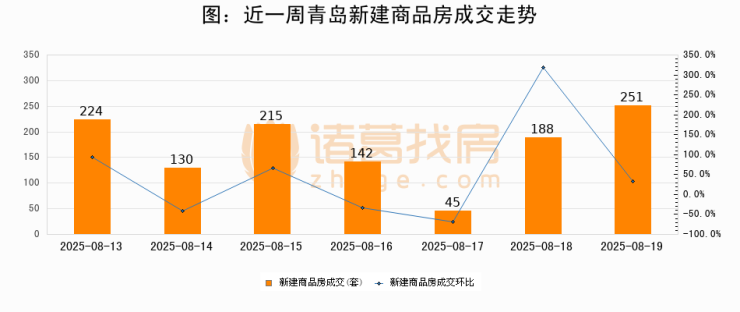 根据青岛市住房和城乡建设局数据显示,2025年08月19日青岛新建商品房成交251套,较昨日增加63套,环比上涨33.5%。近一周青岛新建商品房日均成交171套。08月19日单日成交251套,高于近一周平均水平46.8%。