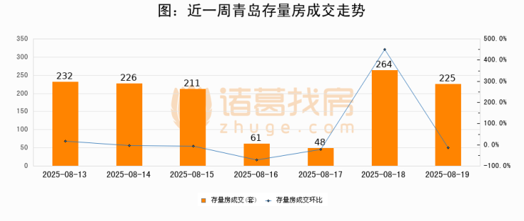 从存量房来看,2025年08月19日青岛存量房单日成交225套,比昨日减少39套,环比下降14.8%。从近一周存量房成交来看,青岛存量房日均成交套数为181套,08月19日单日成交225套,高于近一周平均水平24.3%。