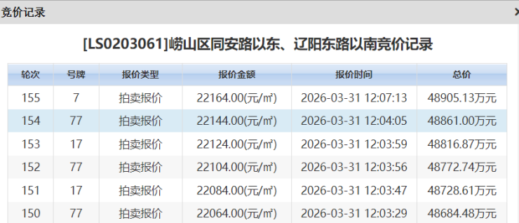 3月31日,“顶流”崂山区近5年最低密宅地同安路地块引来金茂(7号)、海信(17)、海通(55)、青特(77)4家房企再现“诸神之战”,经过155轮,最终被金茂竞得,楼板价22164元/㎡,总价4.89亿,溢价率16.26%。其楼板价超越了“曾地王”张村河南岸越秀青铁和樾府的21045元/㎡。
