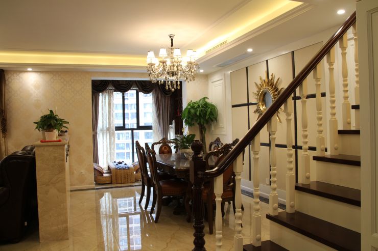 楼梯采用实木材质,实木扶手实木踢步,因为有老年人,整体的材质都选择得比较温和,整体感觉也会比较温馨。