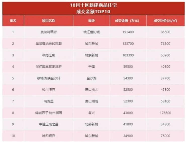与上海类似,杭州的改善型住宅同样受到市场欢迎。杭州透明售房网数据显示,10月份杭州十区新房成交金额TOP10项目中,7个项目单价超过6万元/平方米,TOP3项目均为“6万元+”项目,并且这三个项目销售总金额超过了10亿元。