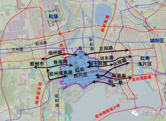 公路:目前红岛内部有三纵三横几条大动脉,开启红岛交通大时代。三纵:环湾大道-双元路快速路,跨海大桥红岛连接线-华中路快速路,岙东路-青威快速路。三横:中心城区北部快速路,正阳路快速路,胶州湾高速等。