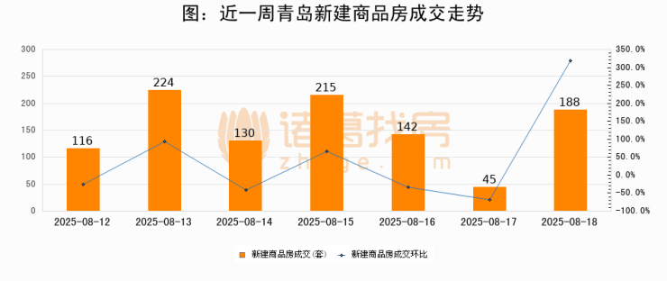 根据青岛市住房和城乡建设局数据显示,2025年08月18日青岛新建商品房成交188套,较昨日增加143套,环比上涨317.8%。近一周青岛新建商品房日均成交152套。08月18日单日成交188套,高于近一周平均水平23.7%。