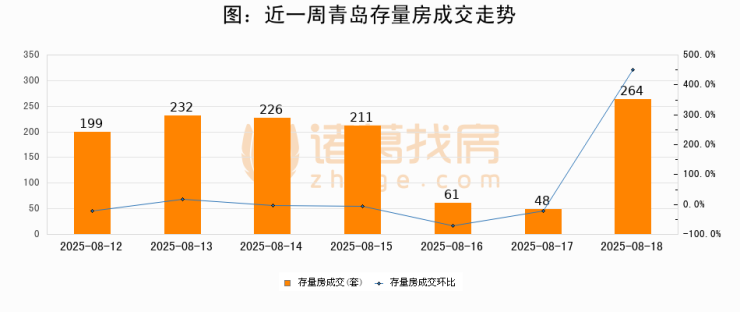 从存量房来看,2025年08月18日青岛存量房单日成交264套,比昨日增加216套,环比上涨450%。从近一周存量房成交来看,青岛存量房日均成交套数为177套,08月18日单日成交264套,高于近一周平均水平49.2%。