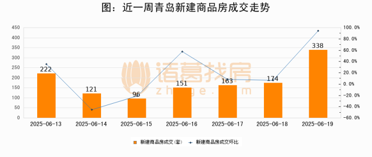 根据青岛市住房和城乡建设局数据显示,2025年06月19日青岛新建商品房成交338套,较昨日增加164套,环比上涨94.2%。近一周青岛新建商品房日均成交181套。06月19日单日成交338套,高于近一周平均水平86.7%。