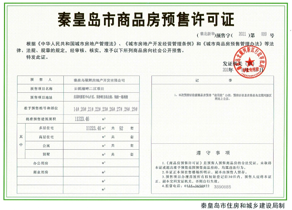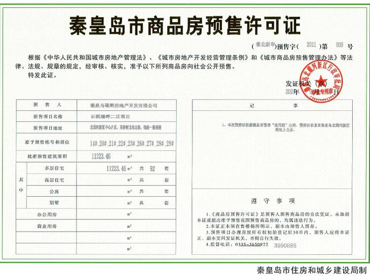- (秦北新审)预售字(2022)第002号 详情发证时间 2022-04-19绑定楼栋获证楼栋:11号楼、12号楼、16号楼、17号楼、18号楼 批准预售建筑面积:6812.12㎡ 预售套数:56套