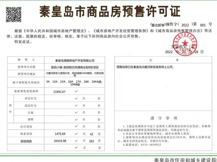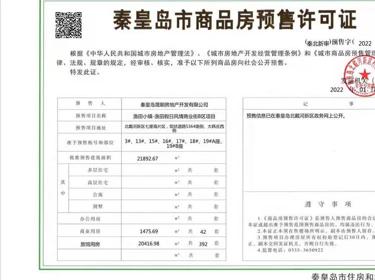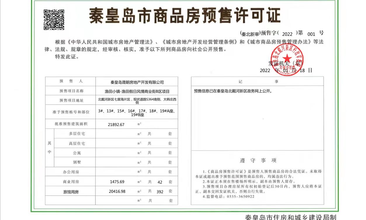 - (秦北新审)预售字(2022)第001号 详情发证时间 2022-01-18绑定楼栋准予预售栋号和部位:3#、13#、15#、16#、17#、18#、19#A座、19#B座; 批准预售建筑面积:21892.67㎡ 商业用房 1475.69㎡ 共42套 旅馆用房 20416.98㎡ 共392套证件照片
