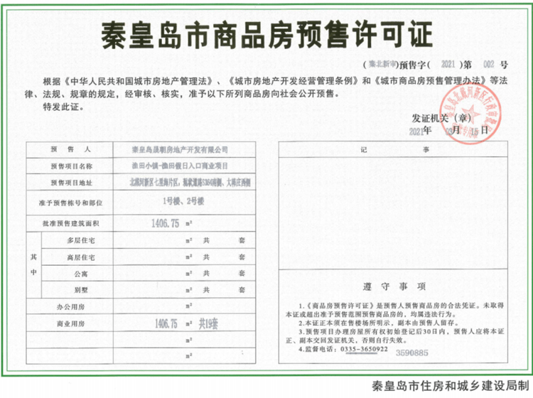- (秦北新审)预售字(2021)第002号 详情发证时间 2021-03-15绑定楼栋准予预售栋号和部位:1号楼、2号楼; 批准预售建筑面积:1406.75㎡ 商业用房 1406.75㎡ 共19套。证件照片