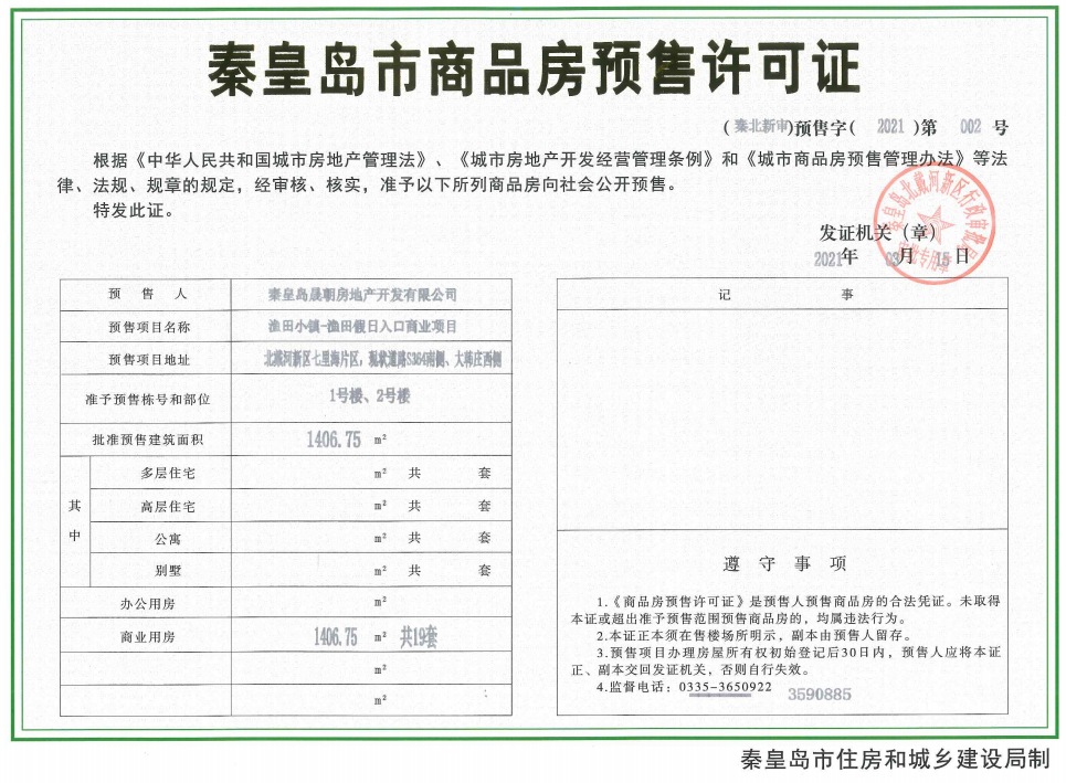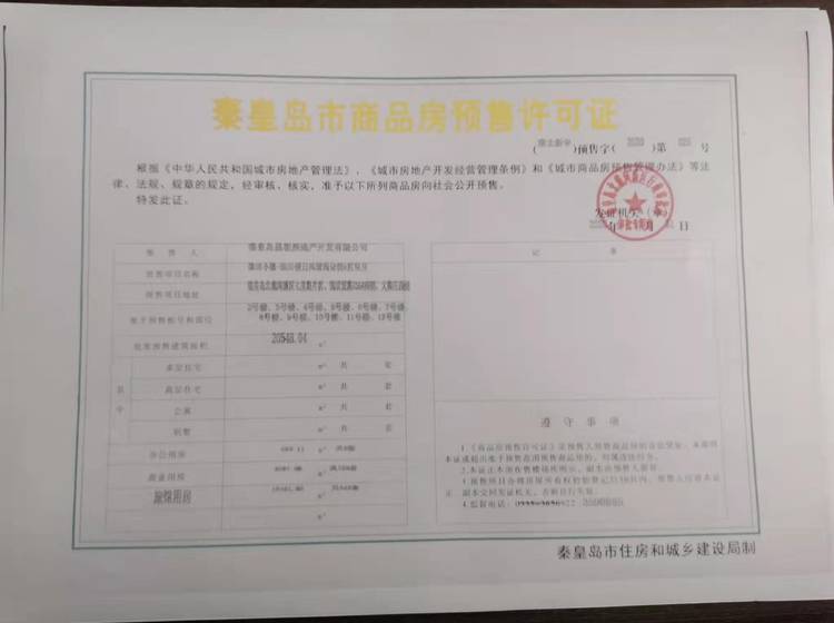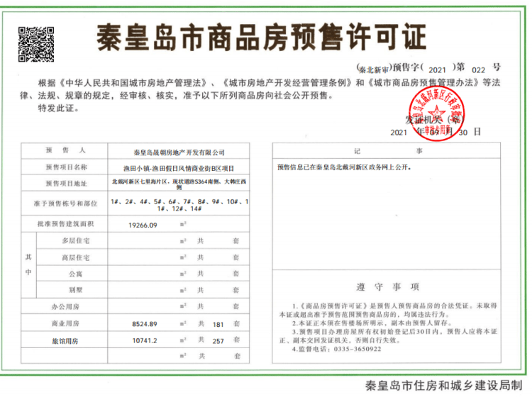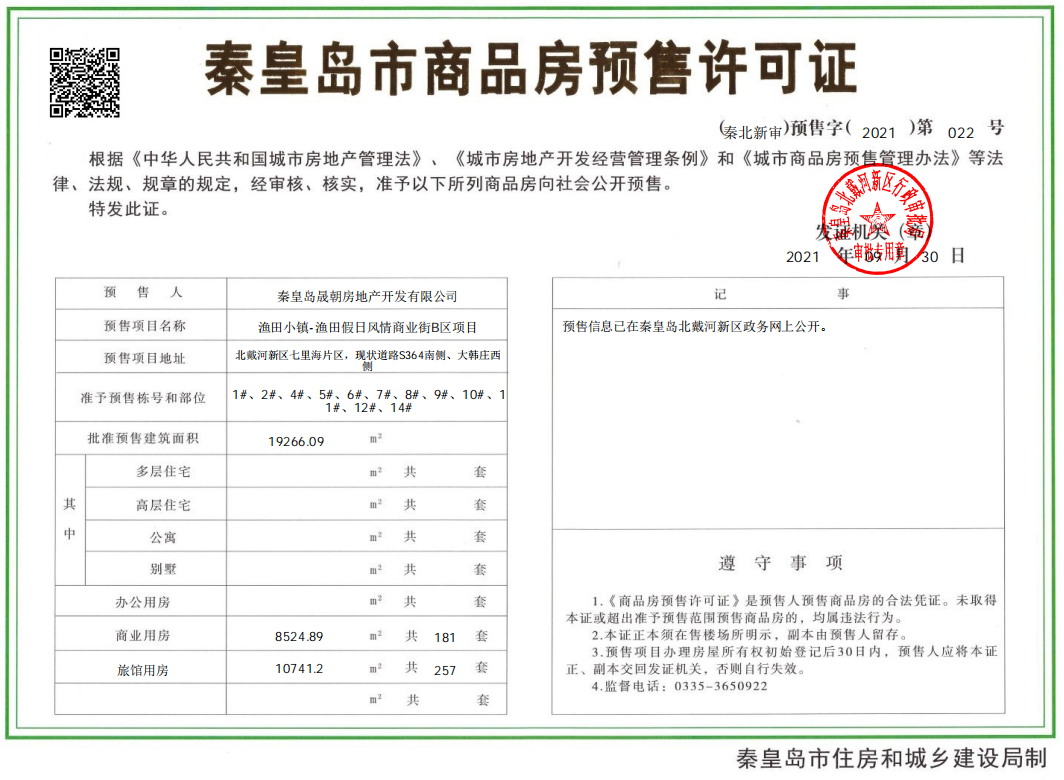 - (秦北新审)预售字(2021)第022号 详情发证时间 2021-09-30绑定楼栋准予预售栋号和部位:1#、2#、4#、5#、6#、7#、8# 、9#、10#、11#、12#、14#; 批准预售建筑面积:19266.09㎡ 商业用房 8524.89㎡ 共181套 旅馆用房 10741.2㎡ 共257套证件照片