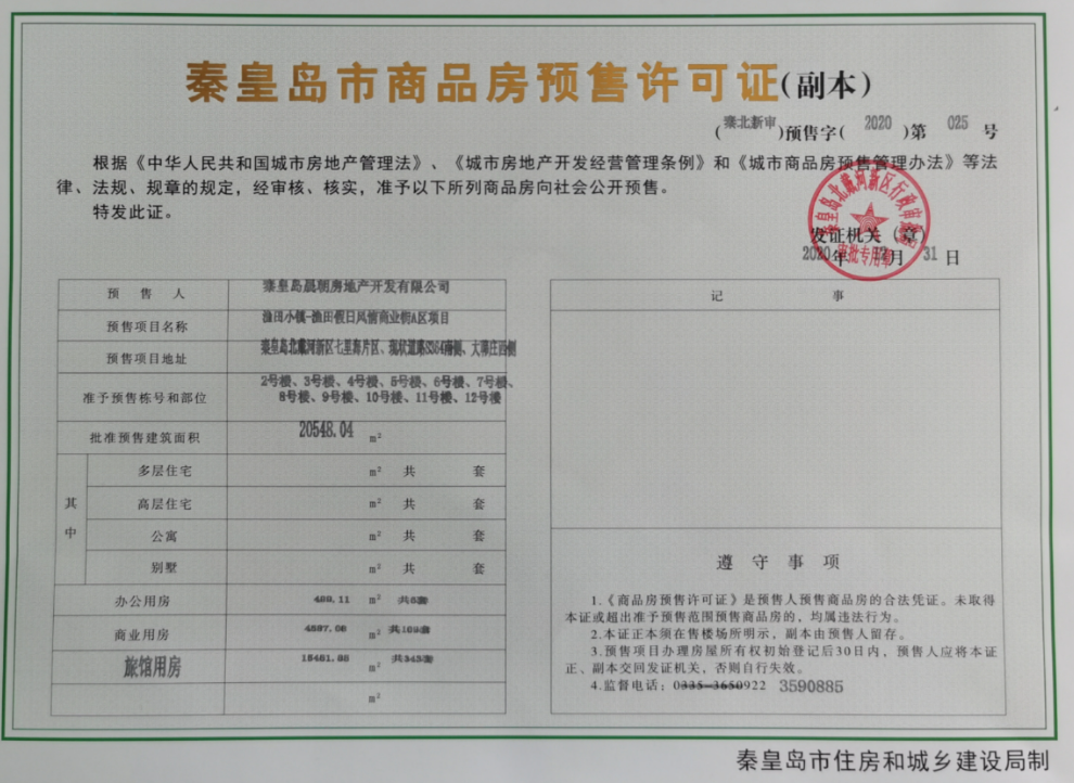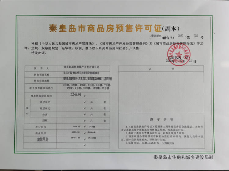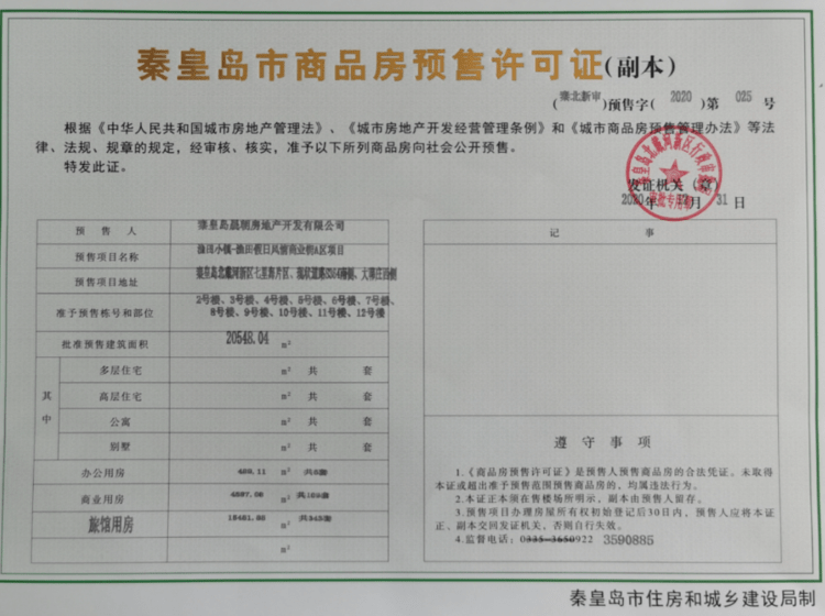 - (秦北新审)预售字(2020)第025号 详情发证时间 2020-12-31绑定楼栋准予预售栋号和部位:2号楼、3号楼、4号楼、5号楼、6号楼、7号楼、8号楼、9号楼、10号楼、11号楼、12号楼; 批准预售建筑面积:20548.04㎡; 办公用房 400.11 m 共6套; 商业用房 4587.08㎡ 共109套; 旅馆用房 15461.85㎡ 共343套。证件照片