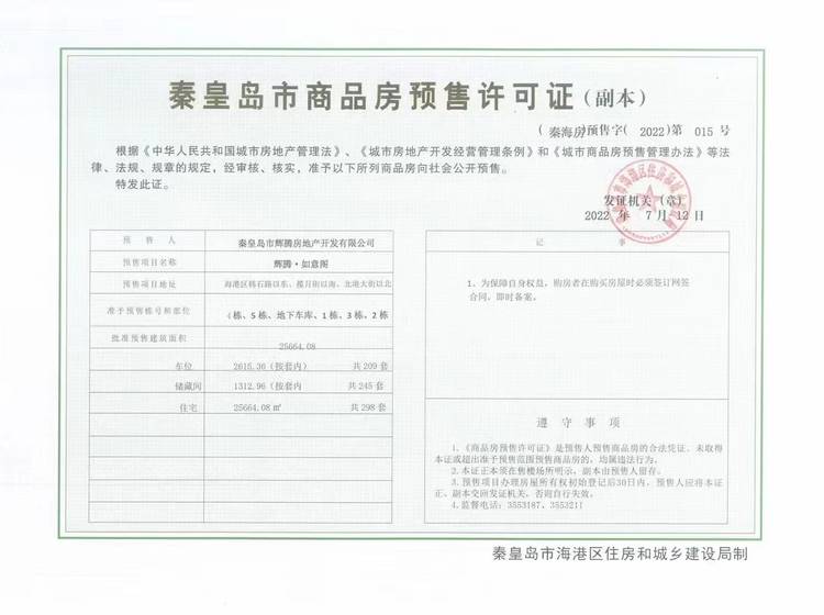 - (秦海房)预售字(2022)第015号 详情发证时间 2022-07-12绑定楼栋预售楼栋:1栋、2栋、3栋、4栋、5栋、地下车库 预售建筑面积:25664.08㎡ 车位 2615.36㎡(按套内),共209套; 储藏间 1312.96㎡(按套内),共245套; 住宅 25664.08㎡,共298套。证件照片