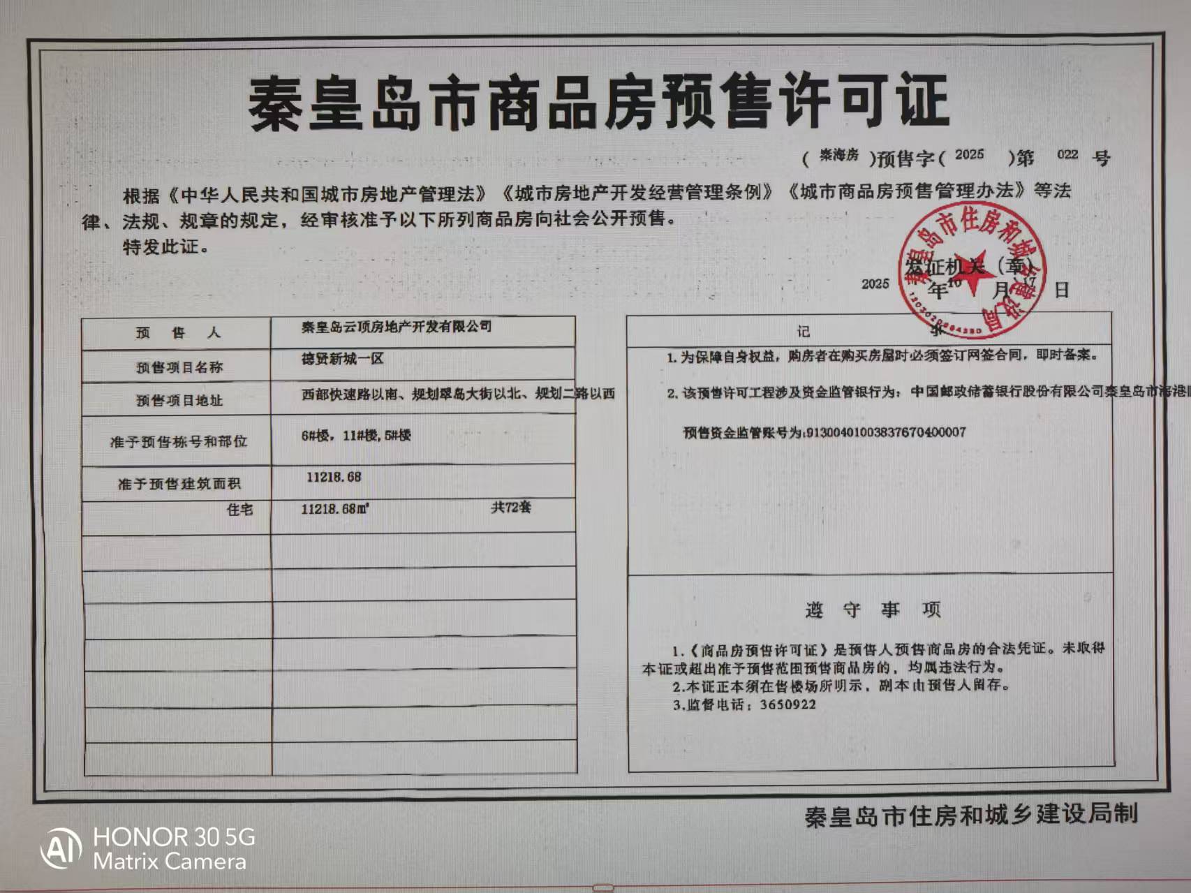 - (秦海房)预售字(2025)第022号 详情发证时间 2025-10-17绑定楼栋预售范围:5#楼、6#楼、11#楼准予预售建筑面积:11218.68㎡住宅:11218.68㎡,共72套证件照片