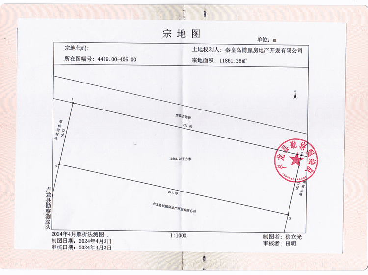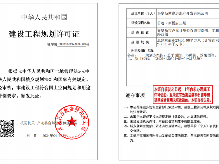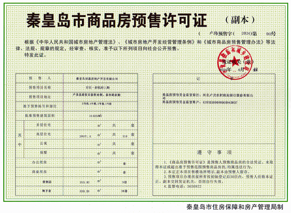 - (卢房)预售字(2024)第003号 详情发证时间绑定楼栋准予预售栋号和部位:1-4号楼, 预售建筑面积21425.81㎡,高层住宅20671.6平方米,共216套;便利店215.92㎡,共3套;地下室538.29㎡,共26套。证件照片