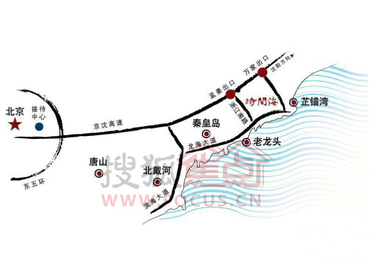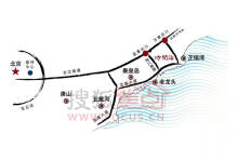 线路二:从G1京哈高速万家出口向正东方向出发,沿匝道行驶约950米,直行进入东戴河大街,沿东戴河大街行驶5.4公里,向右转进入滨海公路,沿滨海公里行驶5.8公里,即可到达到达;