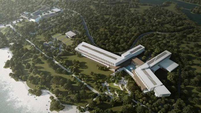 从释放的效果图来看,酒店设计极具现代感。建筑群以白色与浅灰色为主色调,线条流畅,优雅大气。