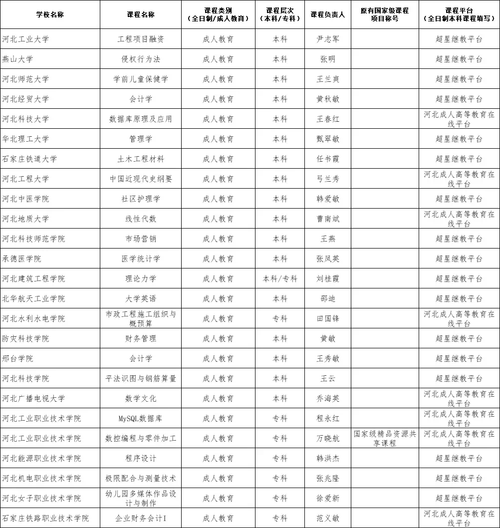 河北省高校高等学历继续教育精品在线开放课程拟立项建设名单