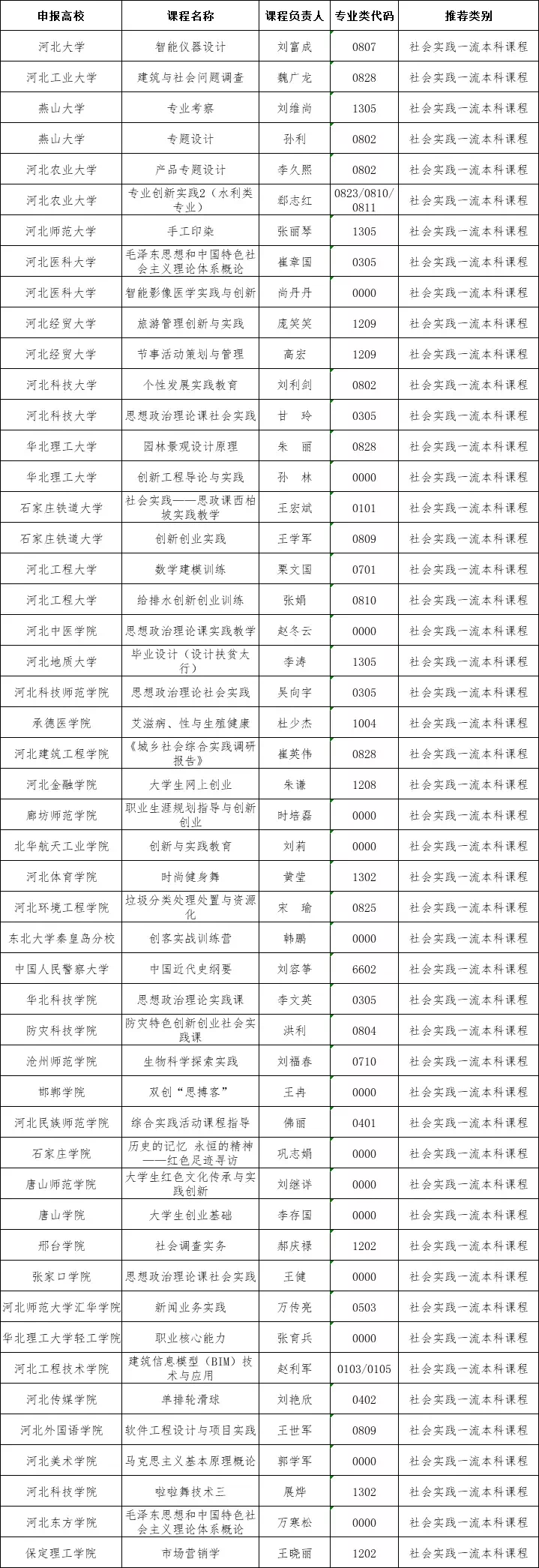 河北省社会实践一流本科课程拟立项建设名单