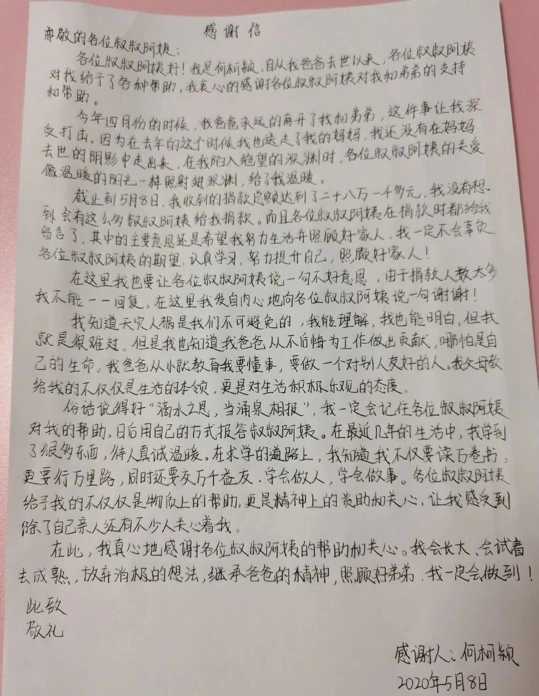 今天,是何荣广教导员离去整整一个月的日子。昨晚,青龙县公安局收到了他的女儿何柯颖写的一封感谢信,感恩所有关心这个破碎警察家庭的好心人!