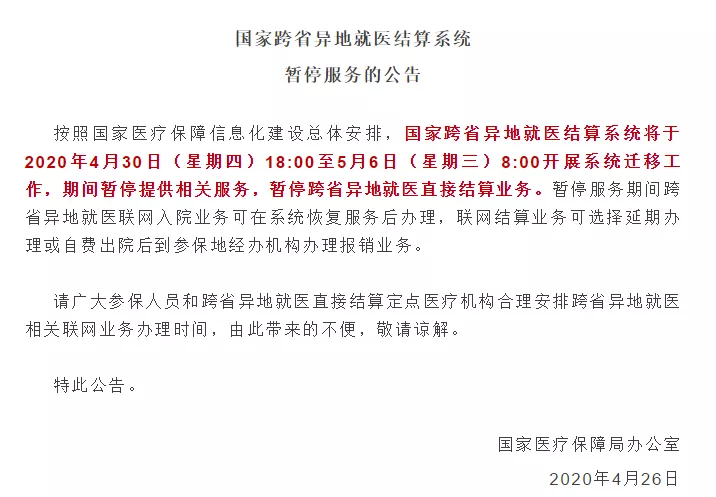 国家跨省异地就医结算系统将于2020年4月30日(星期四)18:00至5月6日(星期三)8:00开展系统迁移工作,期间暂停提供相关服务,暂停跨省异地就医直接结算业务。