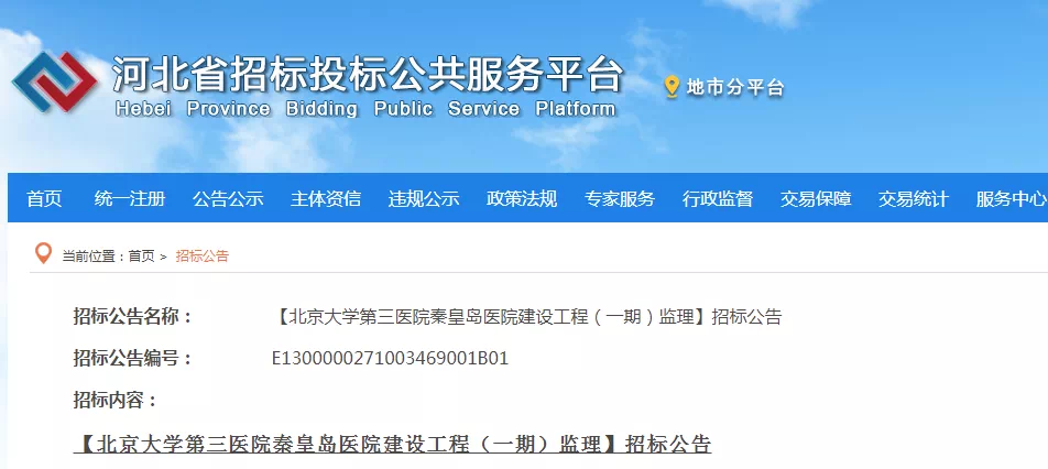 项目概况:北京大学第三医院秦皇岛医院建设工程,建设1200床综合性三甲医院,项目占地20.01公顷,总建筑面积252500平方米,建设内容包括门诊部、住院部、体检中心、生殖中心、美容中心、康复中心、感染科、行政中心、科研中心、倒班宿舍、餐厅、会议中心、动力中心以及场区管网、绿化景观等。概算总投资283031.90万元。