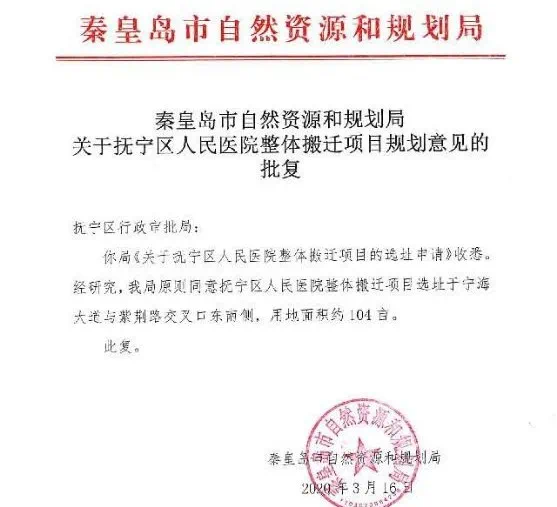 2020年3月16日,抚宁区人民医院整体搬迁项目规划得到批复。根据政府较新消息,抚宁区人民医院整体搬迁工程项目首次环境影响评价信息已经公开,意味着这工程正在稳步推进中。项目总投资55000.00万元。效果图曝光。