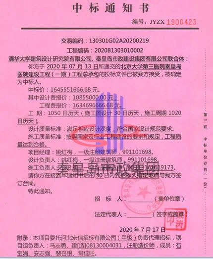 2020年7月,河北招标投标公共服务平台发布北京大学排名前列医院秦皇岛建设工程(一期)监理招标公告。最终清华大学建筑设计研究院有限公司与秦皇岛市政建设集团有限公司联合体于2020年7月17日中标北京大学第三医院秦皇岛医院建设工程(一期)工程总承包项目,中标金额16.45亿元。