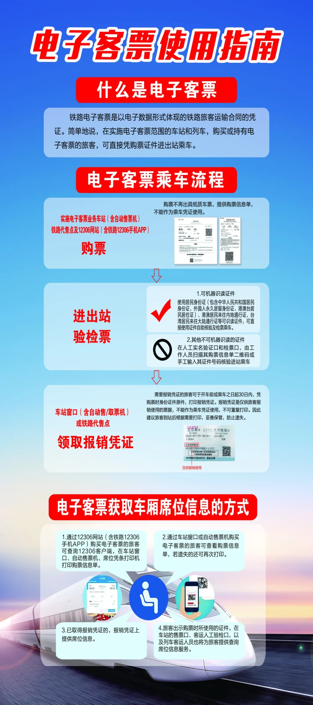 铁路部门提示,有关电子客票实施的详细信息,旅客朋友可通过铁路12306网站和相关车站公告查询。铁路部门欢迎旅客多提建设性意见建议,将不断改善电子客票使用体验,努力为广大旅客创造更加便捷美好的旅行生活。