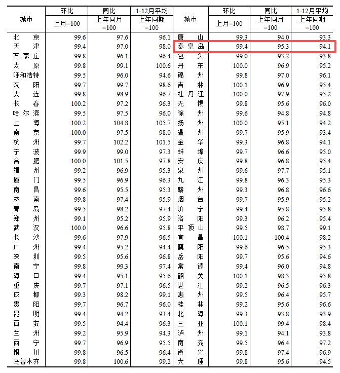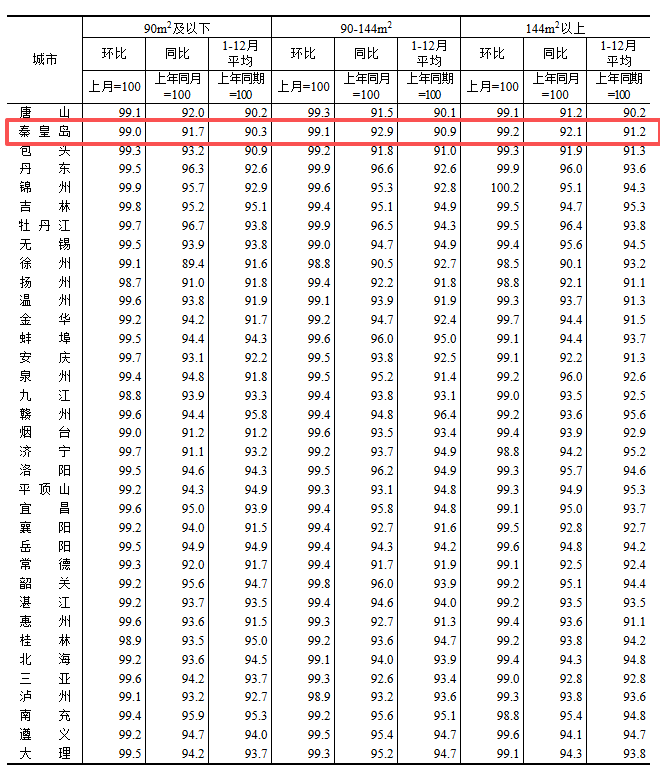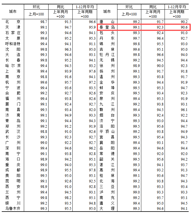根据国家统计局数据,秦皇岛12月新房与二手房房价继续触底,且新房、二手房环比同比跌幅均扩大。