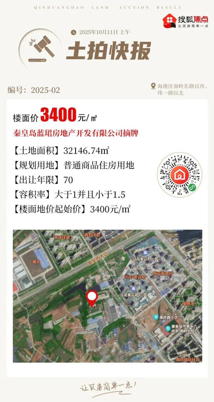 10月11日,秦皇岛西部片区一商住地块由蓝珺地产成功摘牌,成交价约1.64亿元,成交楼面价3400元/㎡。
