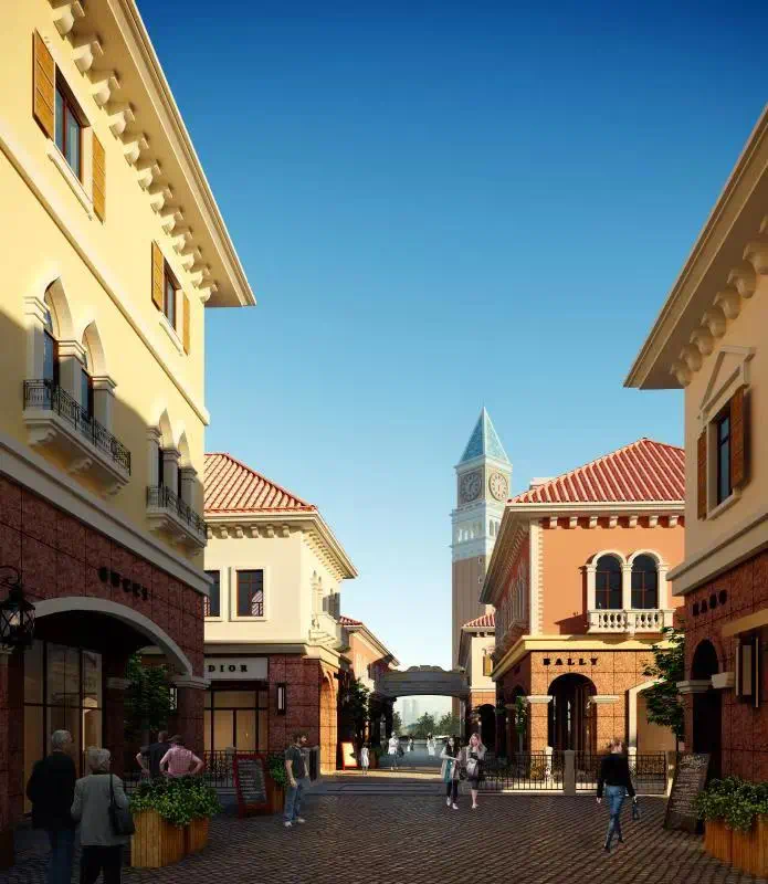 在建的奥特莱斯商业区总建筑面积4.93万平米,规划停车位618个,建筑继续延续奥特莱斯一贯的“小镇风格”,以意大利建筑风格街区为主,淡黄墙色配红色屋顶,弧形门窗搭铁艺围栏,营造出阳光、柔和的生活氛围,同时打造1800米河景风情街,构建“水上奥特莱斯”的独特购物环境,使人们在购买国际一流品牌产品的同时,能够享受生态休闲旅游于一体的全方位、高品质的购物体验。