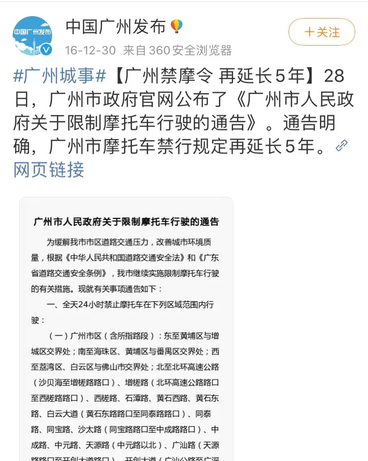 上世纪90年代开始,广州市也开始实施禁、限摩政策,首先限制摩托车新入户发牌。2016年,广州市政府官网公布了《广州市人民政府关于限制摩托车行驶的通告》。通告明确,广州市摩托车禁行规定再延长5年。