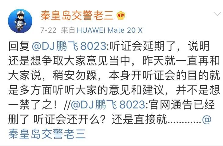 7月22日,据交警老三发布的消息,听证会的时间延期了。