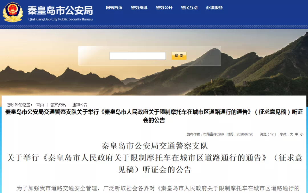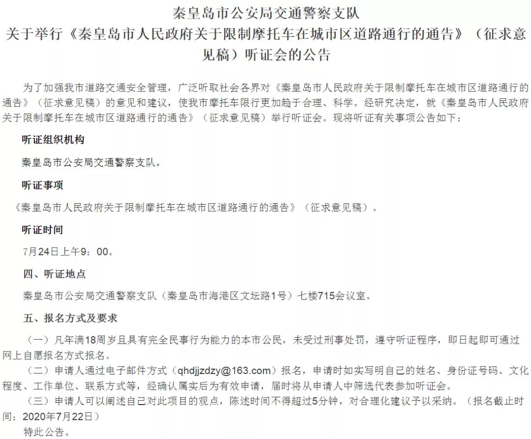 秦皇岛公安发布“禁摩令”听证会的公告。