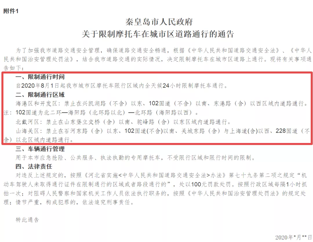 自2020年8月1日起我市城市区摩托车限行区域内全天候24小时限制摩托车通行。