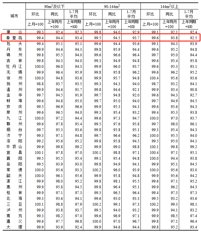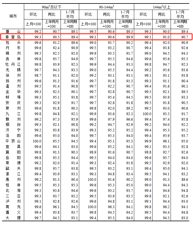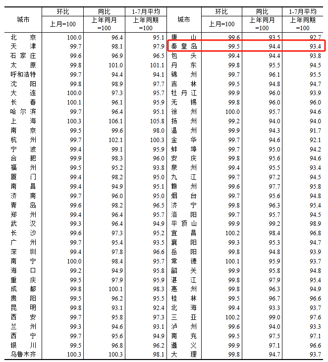 根据国家统计局数据,秦皇岛7月新房与二手房房价依然处于下跌水平,但新房跌幅有所收窄,新房房价继续触底。