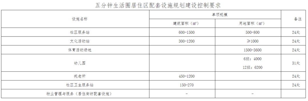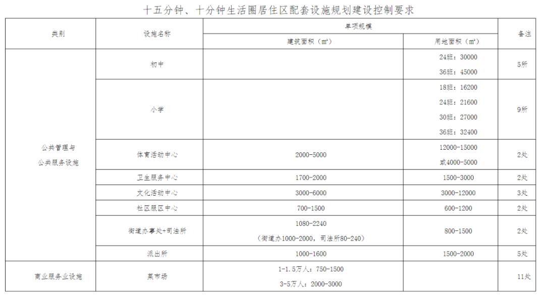 十五分钟和十分钟生活圈居住区配套设施包括初中、小学、社区服务中心、街道办事处、派出所、文化活动中心、体育活动中心、卫生服务中心、便民市场;五分钟生活圈居住区配套设施包括幼儿园、社区服务站、文化活动站、体育活动场地、托老所、社区卫生服务站;居住街坊配套设施主要是物业管理与服务。